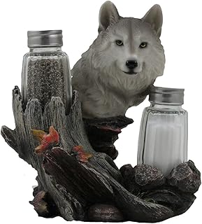 Decorative Gray Wolf Glass Salt and Pepper Shaker Set with Holder Figurine for Cabin and Rustic Lodge Restaurant Bar or Kitchen Table Decor, Wildlife Animal Collectibles & Wolves Sculptures As Gifts for Timberwolves or Wolfpack Fans by DWK