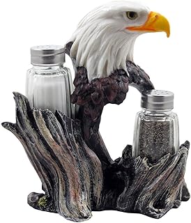 Bald Eagle Glass Salt & Pepper Shakers with Decorative Figurine Display Stand Set for American Patriotic Bar and Kitchen Decor Sculptures or Rustic Lodge Restaurant Tabletop Decorations and Wildlife Bird Gifts