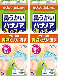 ハナノアーWeb動画ー「ハナノアデカシャワーの使い方」篇(HNA-004) 少し下を向き、洗浄器具を押す圧力で洗浄液をシャワー状に流し込むことで鼻の中を洗浄します。 洗浄液はそのまま鼻から出せるので、洗浄液を口から出す抵抗感もありません。 洗浄器具を押すだけで簡単に洗浄できます。 ハナノアーWeb動画ー「ハナノアaの使い方」篇(HNA-002) 洗浄液を鼻の中に注ぎ込み口から液を排出します。 液を口から出すことで、鼻の奥深くまでしっかり洗浄できます。 プールやお風呂で鼻に水が入ったときはツーンと痛くなるのに、海で泳いでいるときに鼻に水が入ってもあまり痛くないことをご存知ですか? 理由は、海水は体液に近い成分だから。 【ケース販売】ハナノア 鼻うがい 専用洗浄液 爽快クールタイプ 500ml (鼻洗浄器具なし)×20個 小林製薬 598 4個の商品:¥13,363から 商品の説明 鼻の奥に付着した花粉や雑菌をしっかり洗い流すことができます。 体液に近い成分でできているので、鼻がツーンと痛くなりません。 ※鼻粘膜が弱い方や、鼻の状態によっては、涼感香料により刺激を感じる場合があります。 ノズルを鼻の穴に入れ、洗浄液を流し込むだけで、簡単に鼻うがいができます。 クールな使用感でスッキリ爽快。 商品の情報 詳細情報 登録情報 ご意見ご要望 さらに安い価格について知らせる?